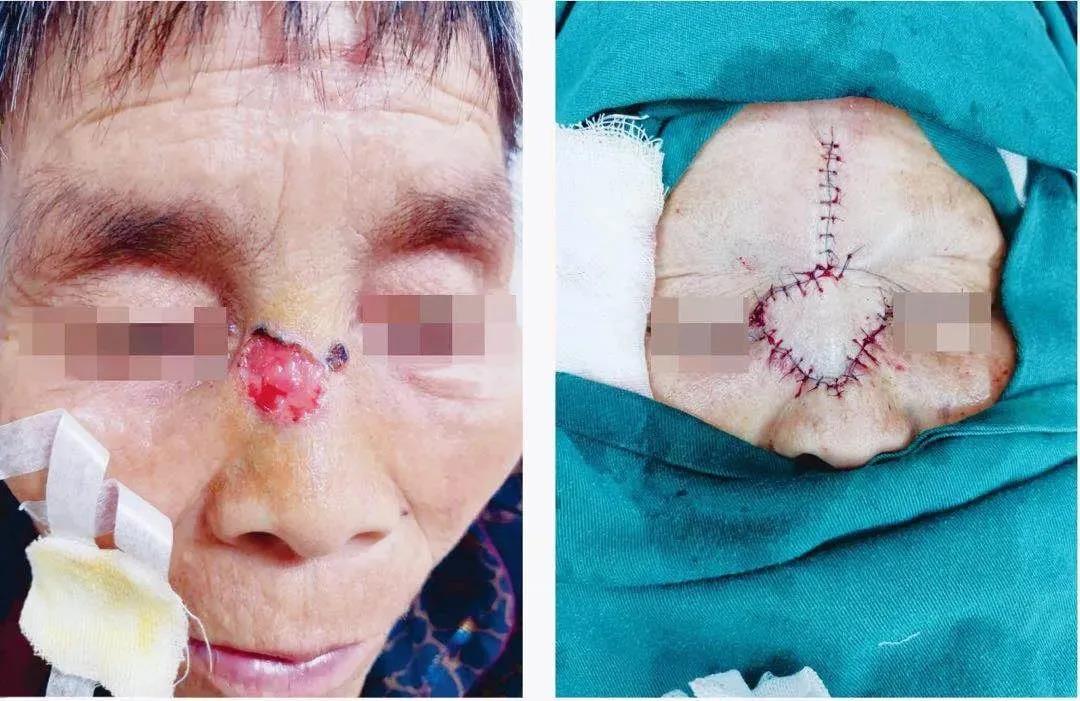 一名67岁老人因鼻背部基底细胞癌导致鼻背部皮肤较大范围破溃而入院。9月底,我院鼻科李明栋主任为她进行了带蒂皮瓣转移修复术。如今,老人鼻部皮瓣成活,已逐渐恢复正常外观。
